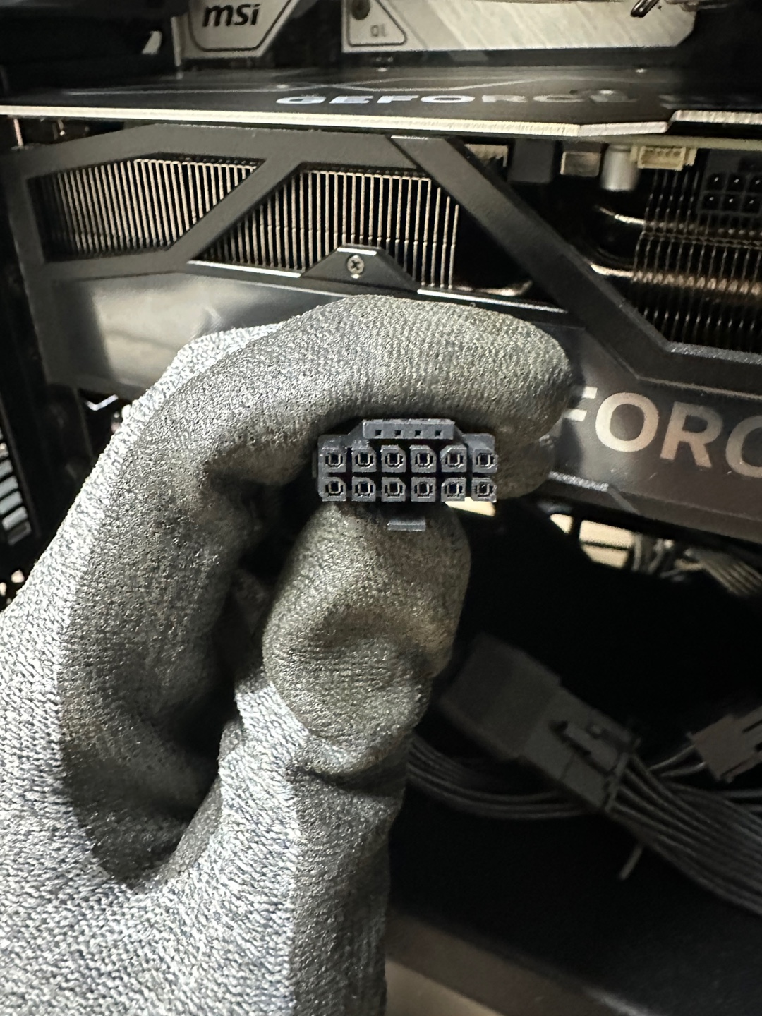 12VHPWR 단자이다. 예전 파워를 그대로 사용하고 그래픽카드만 RTX 40시리즈로 업그레이드 하는 경우 아래와 같이 변환을 해줘야 한다. 문어발 같아서 미관상 매우 안좋다.소모 전력에 따라 PCIE Express 케이블을 사진과 같이 두개 이상을 연결해줘야 한다.