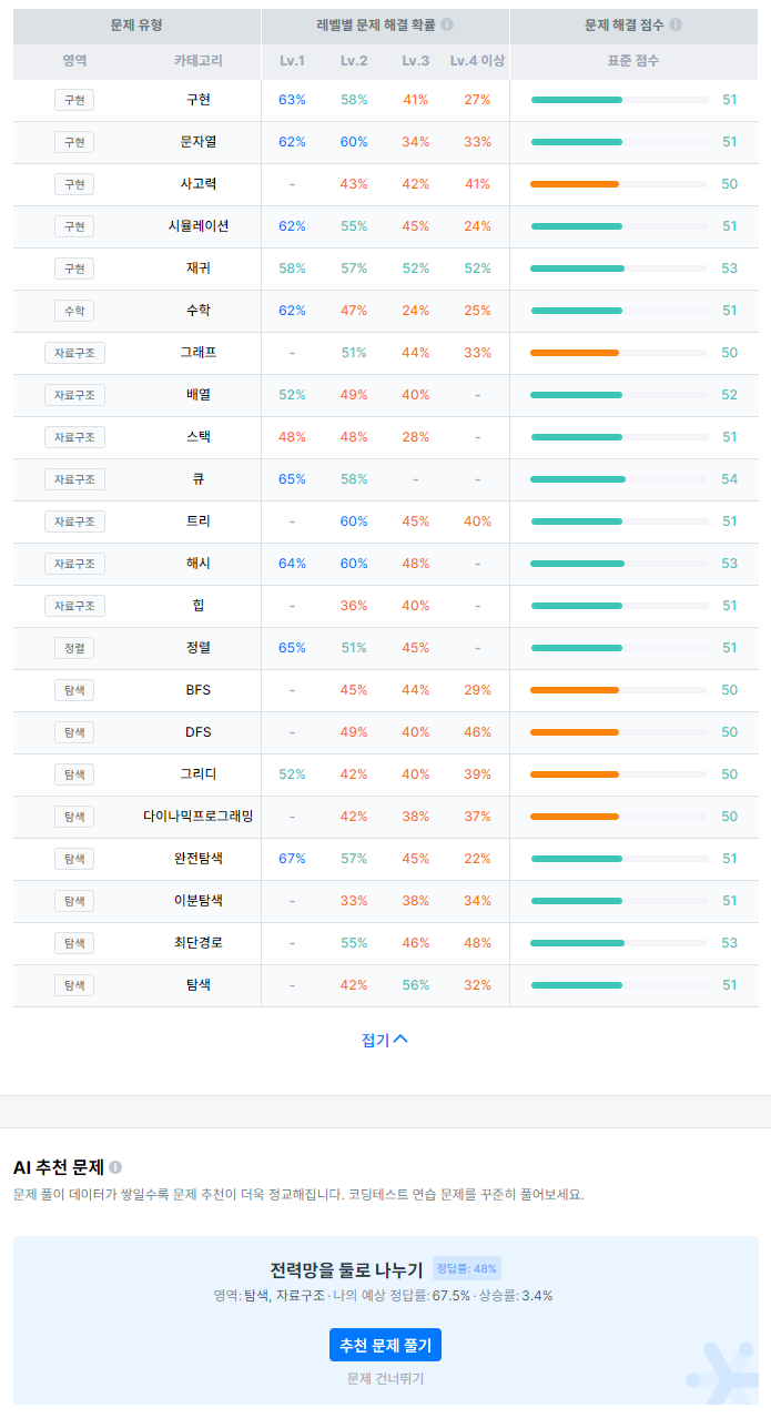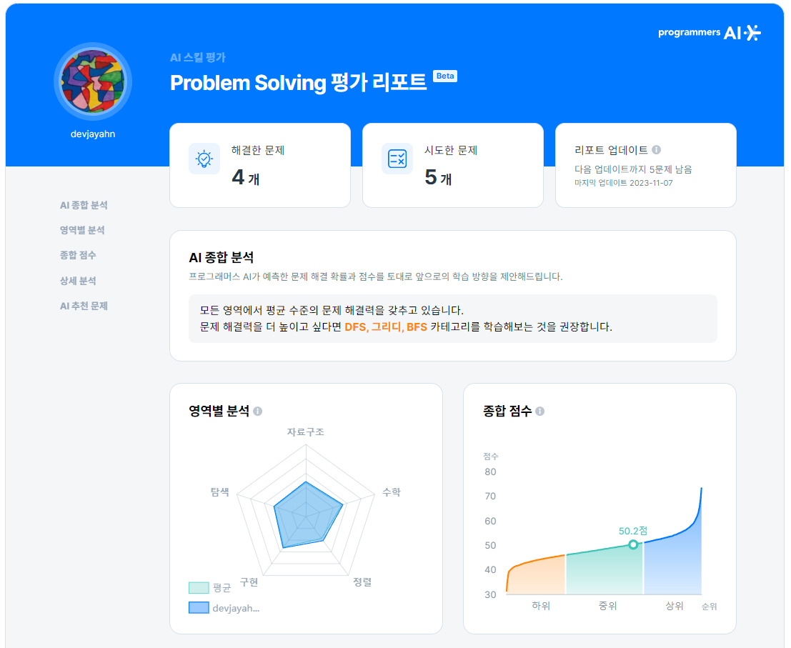 이번에 프로그래머스에서 문제 풀어보는데, 5문제 이상 시도하면 AI가 리포트를 작성해준대서 도전해봤다.