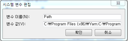 Path에 Yarn경로를 지정해준다. 이전에 해줬을텐데 Java 프로젝트를 진행하면서 바꿔주다가 빼먹었나보다.